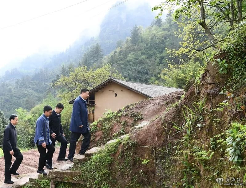 △2019年4月15日下午,在石柱土家族自治县中益乡华溪村,习近平踏着湿滑的石阶登上陡坡,前往贫困户谭登周家看望。