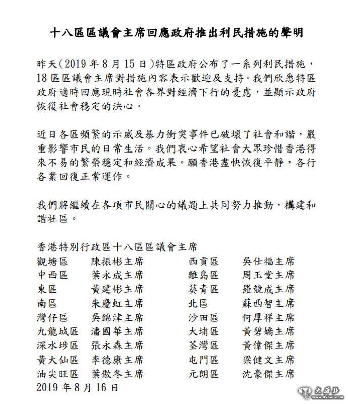 ·香港18区区议会主席联署发表声明:支持特区政府利民措施