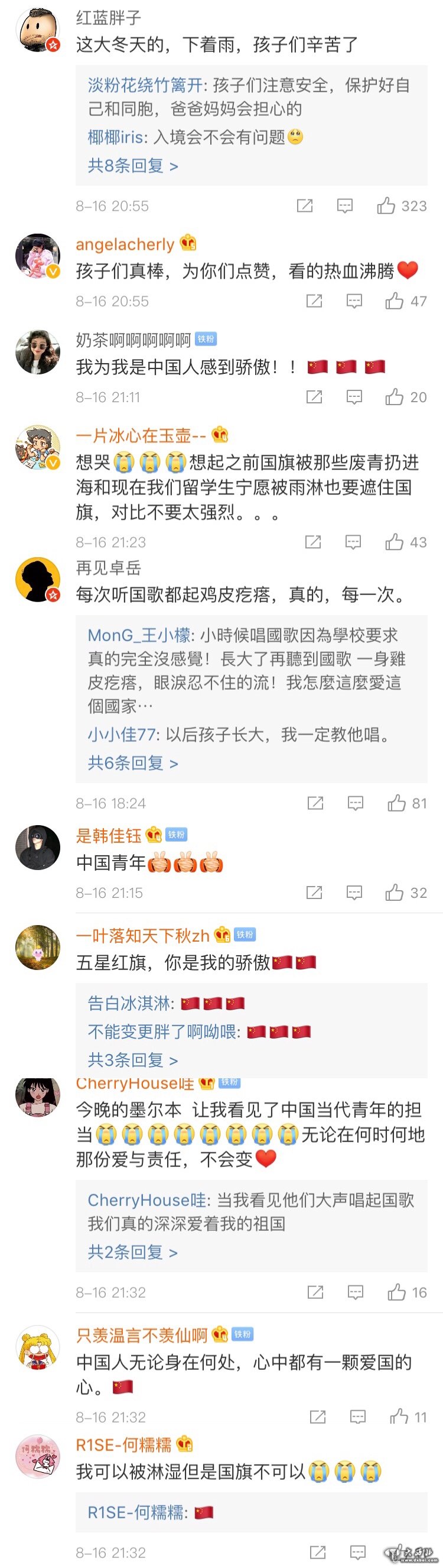 16日晚,在澳洲墨尔本的中国留学生齐聚当地维多利亚图书馆门口驳斥香港游行示威者。爱国留学生在现场高举中华人民共和国国旗,并用手机展示国旗图片,齐声高唱国歌。当晚墨尔本有雨,留学生更是主动撑伞优先护住了国旗。微博网友们看到视频后纷纷表示,这些视频让人感觉特别燃,特别热血,也希望海外游子能够在外注意安全,祖国永远是你们坚强的后盾。