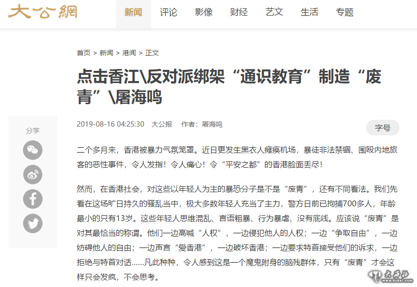 16日,《大公报》发表香港特别行政区全国政协委员、香港新时代发展智库主席屠海鸣评论文章。文章指出,反对派绑架“通识教育”是制造“废青”罪魁祸首!这些年轻人思维混乱、言语粗暴、行为暴虐、没有底线,应该说“废青”是对其最恰当的称谓。