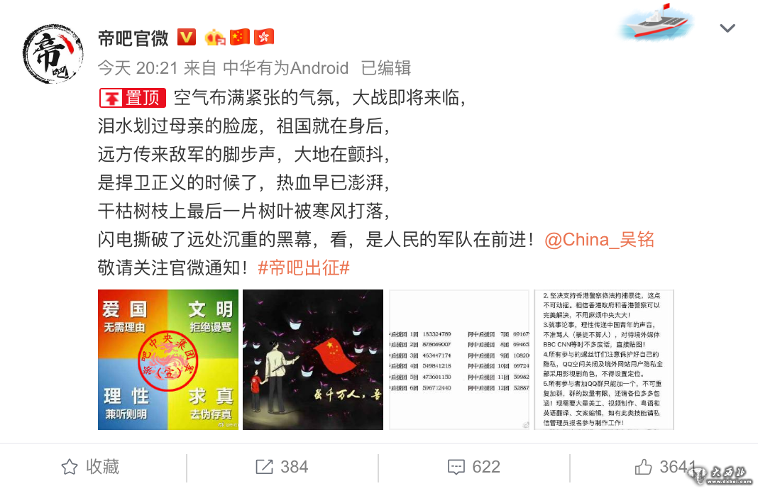16日,帝吧官微在新浪微博发文称:爱国无需理由,文明拒绝谩骂,理性兼听则明,求真去伪存真!网友纷纷力挺并转发!