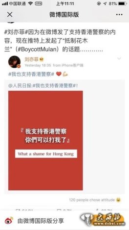 ·艺人刘亦菲昨日发微博“撑警”,今推特掀起#抵制木兰#活动