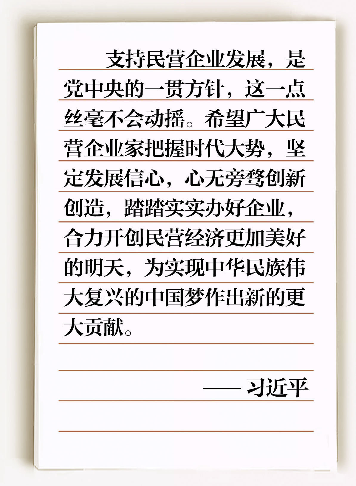 2018年10月20日,习近平总书记给“万企帮万村”行动中受表彰的民营企业家回信,鼓励他们“心无旁骛创新创造,踏踏实实办好企业,合力开创民营经济更加美好的明天”。习近平总书记回信后,广大民营企业家心气更高、干劲更足。
