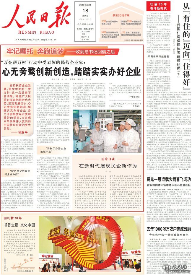 人民日报推出“牢记嘱托奔跑追梦——收到总书记回信之后”系列报道,与您一起见证发展变化、感悟初心使命。今天刊发《“万企帮万村”行动中受表彰的民营企业家:心无旁骛创新创造,踏踏实实办好企业》。