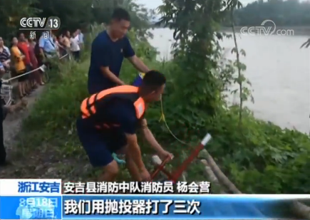安吉县消防中队消防员 杨会营:水流比较湍急,我们皮划艇没法下水,就准备抛投器,我们用抛投器打了三次,都没打到对岸。