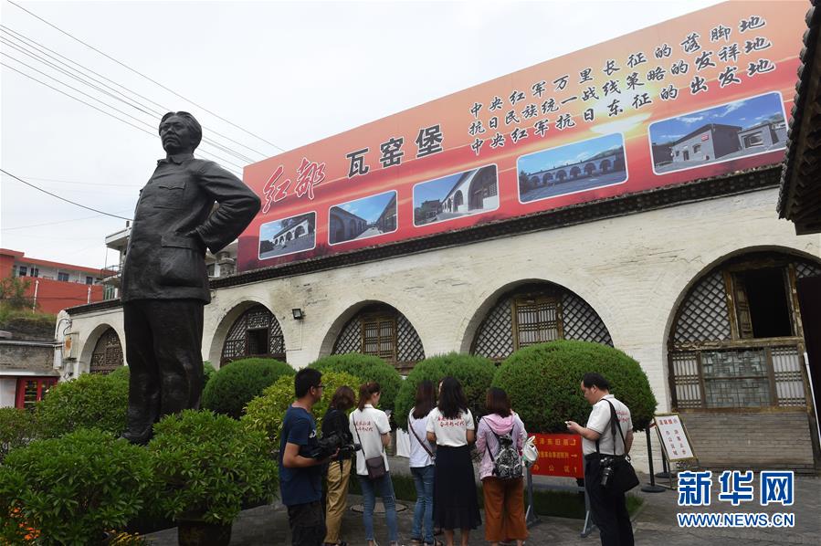 参加“记者再走长征路”活动的记者在陕西省子长县瓦窑堡革命旧址采访(8月9日摄)。新华社记者 罗晓光 摄