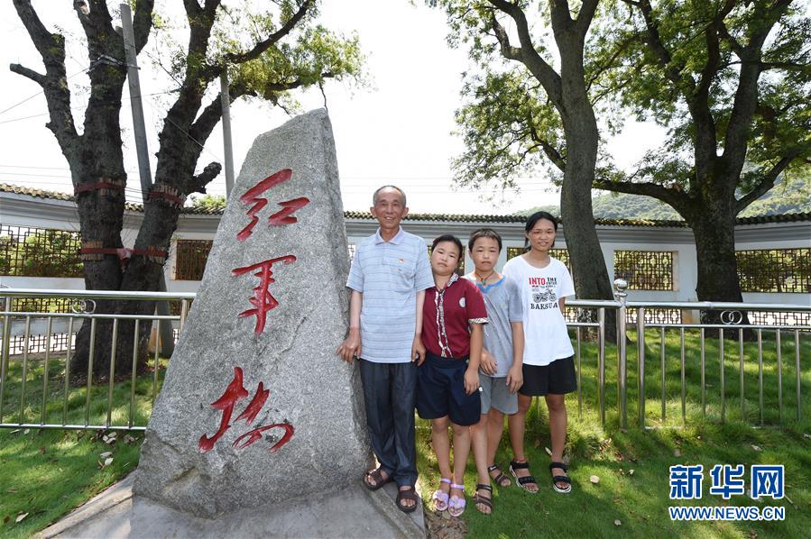 在湖北省石首市桃花山红军树革命烈士纪念园,67岁的守树人刘克树在“红军树”前与他的孙辈合影(8月1日摄)。新华社记者 罗晓光 摄