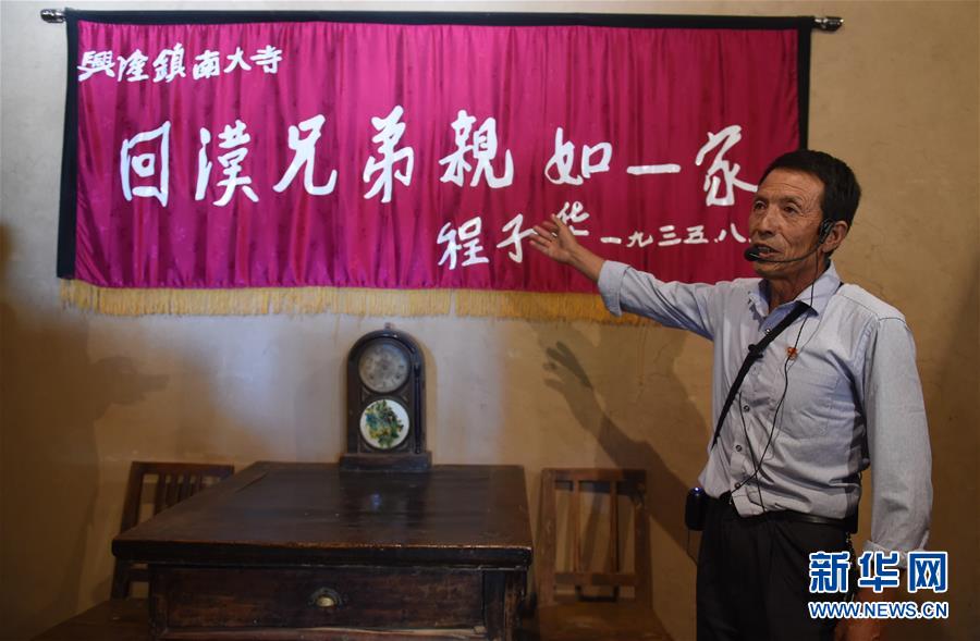 在宁夏西吉县单家集村,西吉县单南村党支部书记单云在介绍“回汉兄弟亲如一家”的锦匾(复制品)(8月11日摄)。新华社记者 罗晓光 摄