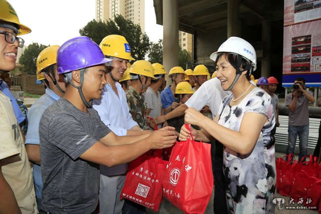 兰州市人大常委会副主任、兰州市总工会主席段迎存给盛达金融广场施工作业的工人们赠送慰问品。