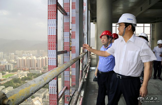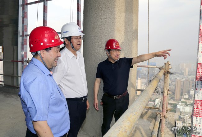 张柯兵(中)在赵满堂董事长陪同下来到在建的盛达金融广场51楼调研。