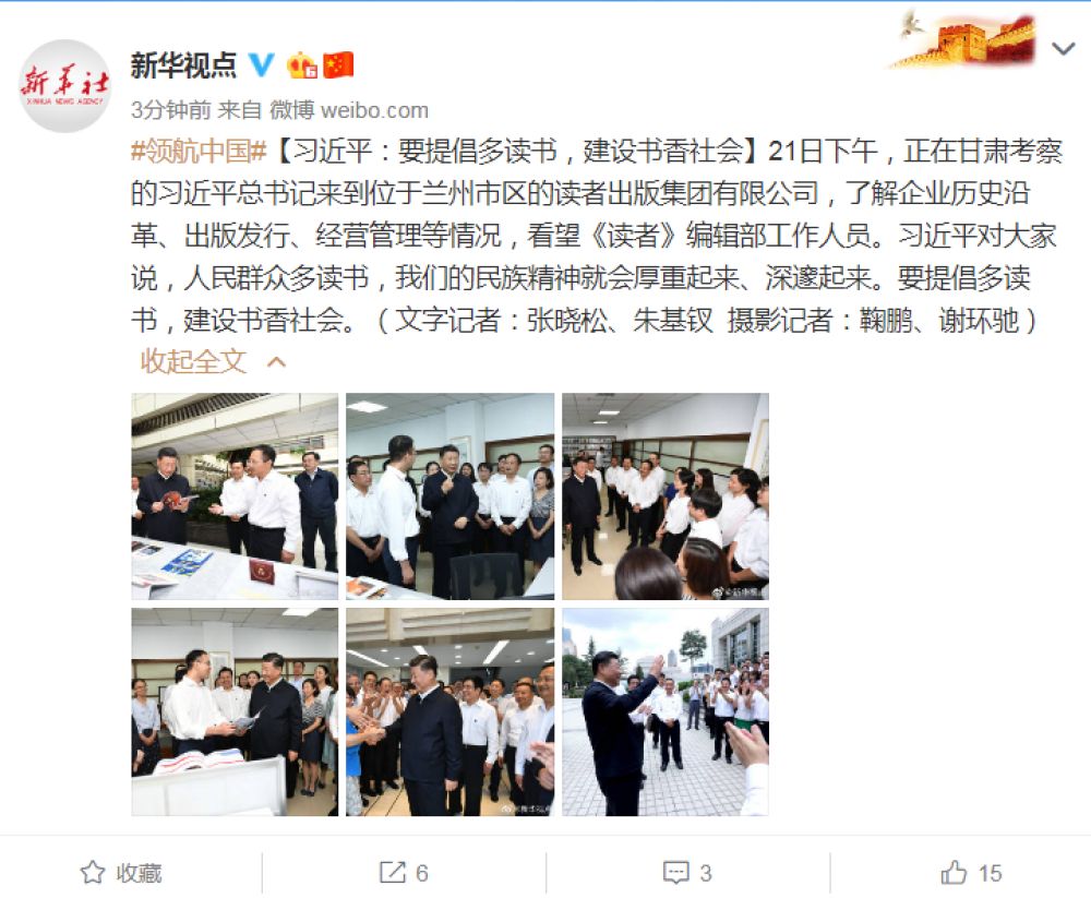 【习近平:要提倡多读书,建设书香社会】21日下午,正在甘肃考察的习近平总书记来到位于兰州市区的读者出版集团有限公司,了解企业历史沿革、出版发行、经营管理等情况,看望《读者》编辑部工作人员。习近平对大家说,人民群众多读书,我们的民族精神就会厚重起来、深邃起来。要提倡多读书,建设书香社会。(文字记者:张晓松、朱基钗摄影记者:鞠鹏、谢环驰)