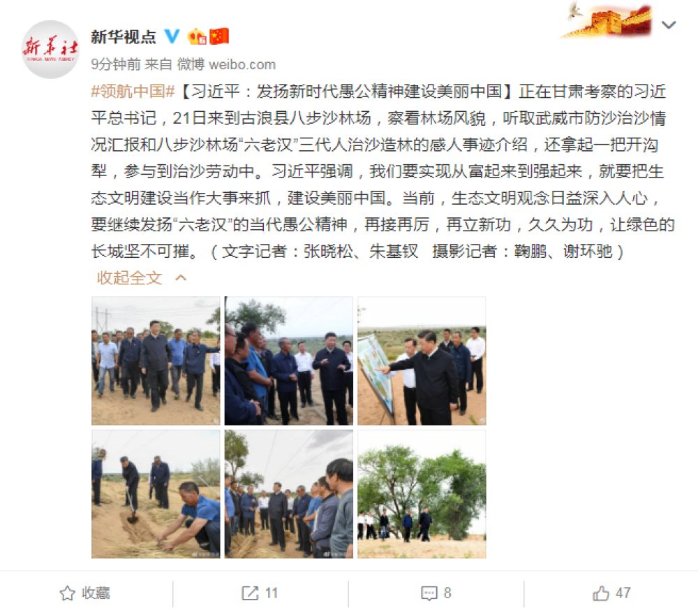 【习近平:发扬新时代愚公精神建设美丽中国】正在甘肃考察的习近平总书记,21日来到古浪县八步沙林场,察看林场风貌,听取武威市防沙治沙情况汇报和八步沙林场“六老汉”三代人治沙造林的感人事迹介绍,还拿起一把开沟犁,参与到治沙劳动中。习近平强调,我们要实现从富起来到强起来,就要把生态文明建设当作大事来抓,建设美丽中国。当前,生态文明观念日益深入人心,要继续发扬“六老汉”的当代愚公精神,再接再厉,再立新功,久久为功,让绿色的长城坚不可摧。(文字记者:张晓松、朱基钗摄影记者:鞠鹏、谢环驰)
