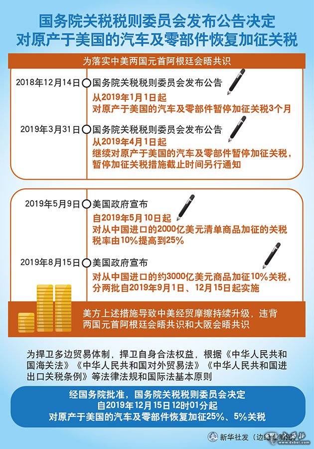 为捍卫多边贸易体制,捍卫自身合法权益,根据《中华人民共和国海关法》《中华人民共和国对外贸易法》《中华人民共和国进出口关税条例》等法律法规和国际法基本原则,经国务院批准,国务院关税税则委员会决定,自2019年12月15日12时01分起,对原产于美国的汽车及零部件恢复加征25%、5%关税。