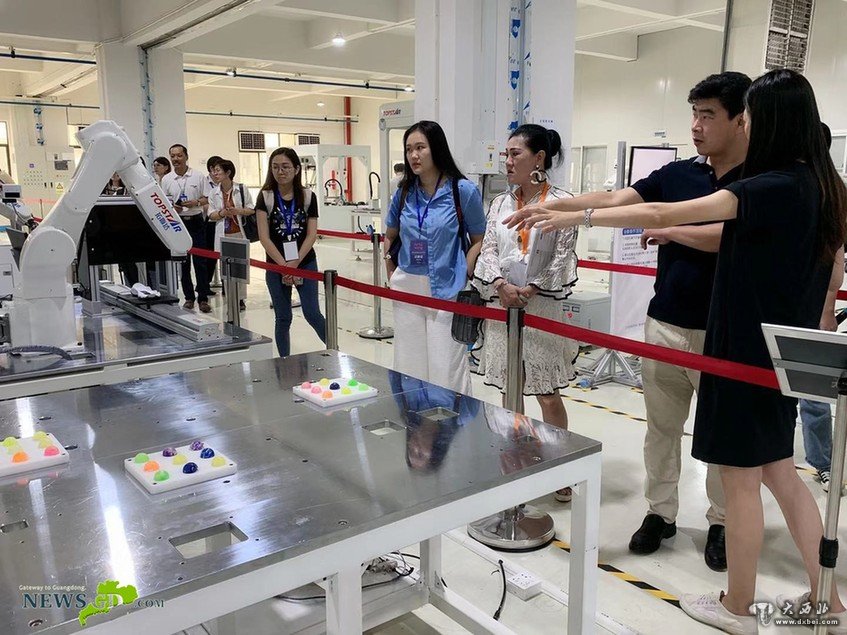 在拓斯达的实验室里,采访团驻足参观工业机器人。