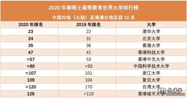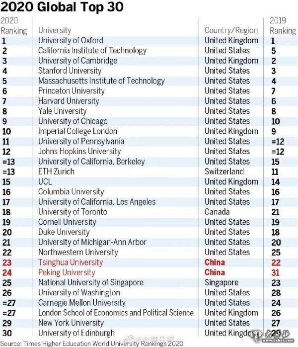 泰晤士高等教育11日发布了2020年度世界大学排名。清华大学和北京大学分列23和24位。