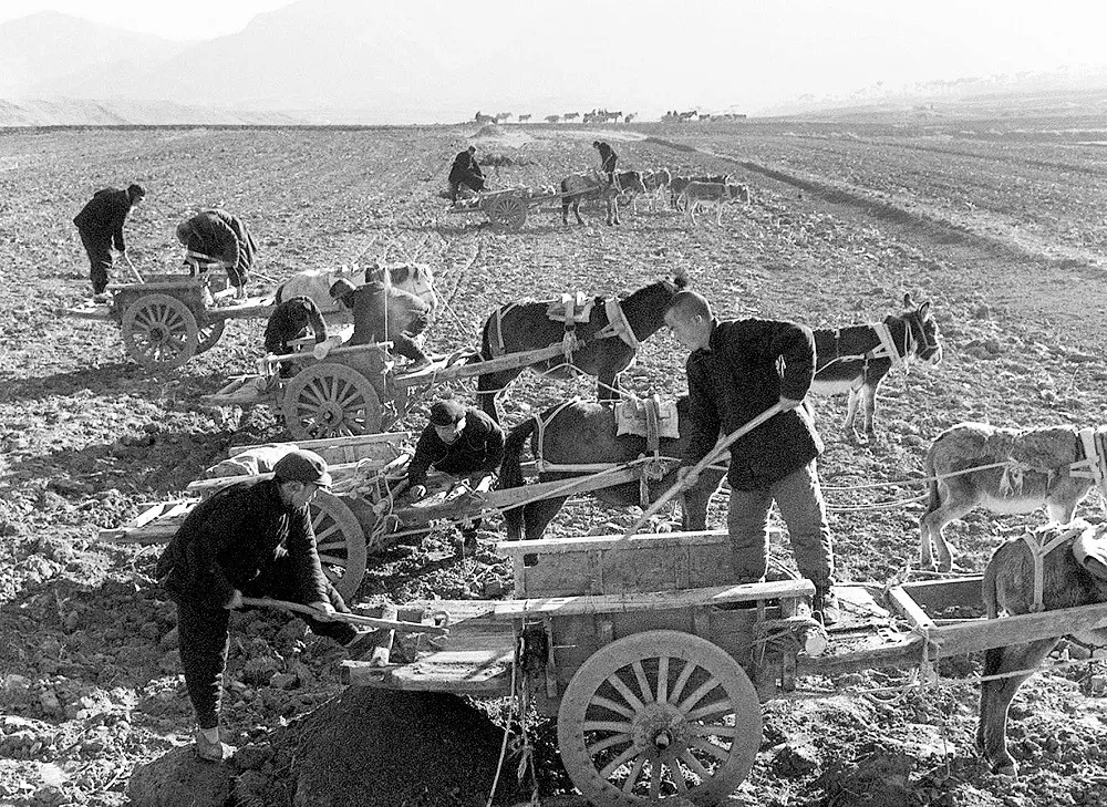1960年,全国农业劳动模范王国藩带领河北遵化县建明人民公社社员,积极作好春耕播种的准备工作。这是社员们在地里卸肥料。新华社记者王旭东摄