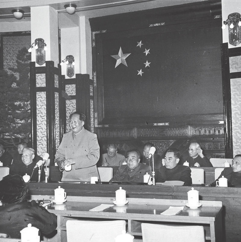 从1955年下半年到1956年初,我国生产资料的社会主义改造进入高潮,社会主义经济建设也有了几年的实践经验,对于苏联经济建设中的一些缺点和问题也逐步有所了解。以苏为鉴,总结自己的经验,探索一条适合中国国情的建设社会主义道路的任务,已经摆在党的面前。毛泽东关于十大关系的思想,就是在这样的背景下产生的。图为1956年5月2日,毛泽东在最高国务会议上进一步阐述十大关系。 新华社发(资料照片)