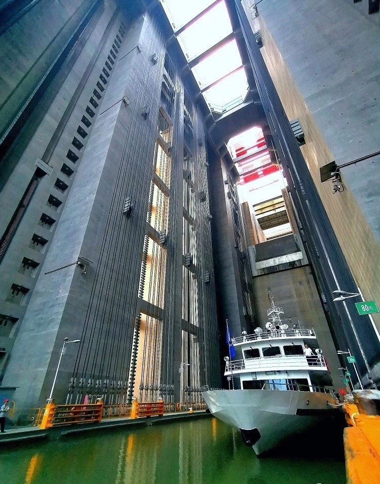 9月11日黄昏,《志远读城》乘坐海巡艇1291号驶入升船机内,想到数米之遥外,就是落差百米的“悬崖”时,不禁替船长捏了一把汗。