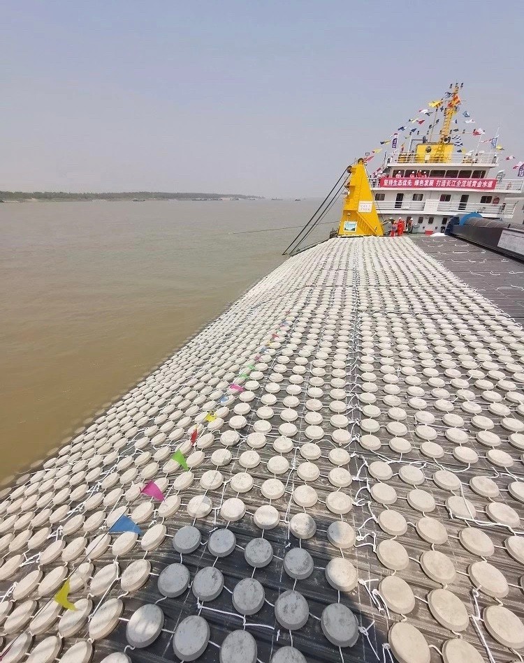 《志远读城》乘海巡艇,来到鄂州江段的戴家洲水道整治现场,看到了热火朝天的立体施工图景:岸上工程,采取生态化钢丝网格、生态护坡砖等生态护岸结构,实现陆上植被和河岸景观的较快恢复;滩上工程,则用生态固滩技术,重建了滩上植被,整个工程用的草籽就有十多种;水下工程,为了控制住水中“流动的沙丘”,采用50年不腐烂的无纺布,并在上面拴满30公斤重的水泥预制块,用专用铺排施工船沉放到江底,稳固河床。人们形象地称之为在江底“铺地砖”。