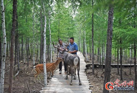 魏然宝(右)的鹿苑,如今有了100多只不同品种的鹿(潘迪/摄)