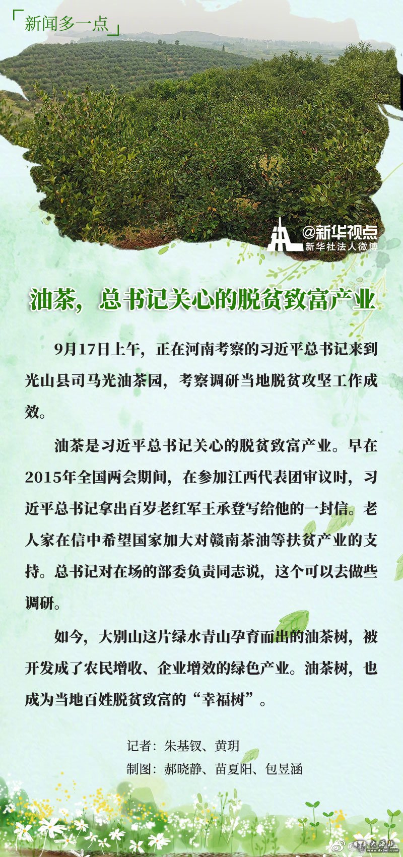 习近平总书记17日上午前往河南省光山县司马光油茶园和文殊乡东岳村,考察调研当地脱贫攻坚工作成效和中办在光山县扶贫工作情况,看望慰问老区群众。