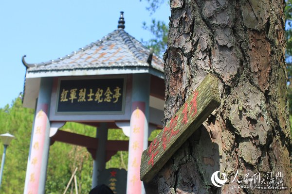 红军烈士纪念亭旁,十七棵青松挺拔,松树上挂着17位当年参军的华氏青年的姓名牌。艾鑫摄