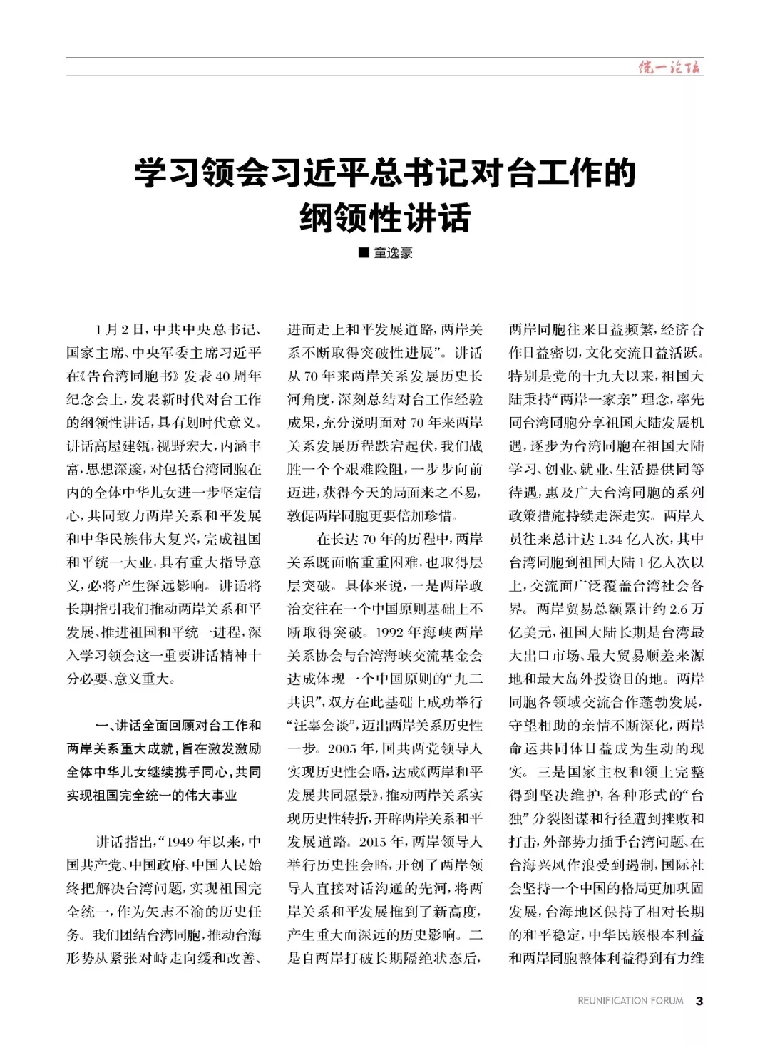 《统一论坛》刊登重要文章