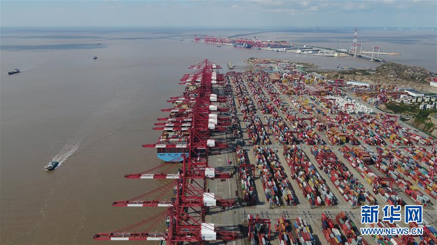 长江口外,东海之滨。从空中俯瞰,上海洋山港犹如一艘大船乘风破浪。