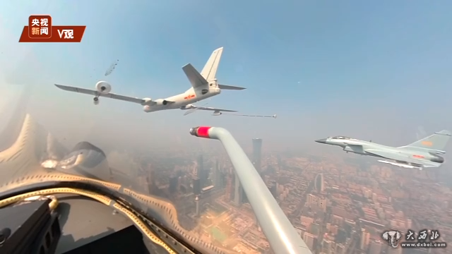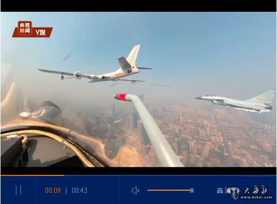 加受油机梯队接受检阅。轰油-6伸出输油管,演示为歼-10B战斗机空中加油,受油机距加油机的加油锥套只有5米。长着翅膀的加油站,让战机有了更大的作战半径。