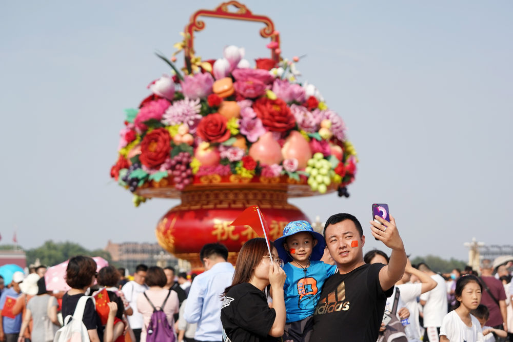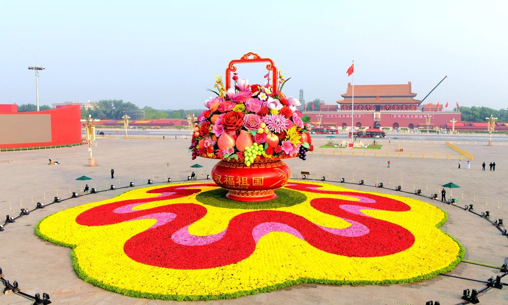 天安门广场,国庆花坛第34次亮相。从1986年至2002年的“五饼式”,到2003年至2008年的“画卷式”,再到2009年至今的“花篮式”,每年的国庆花坛都是八方游客争相合影留念的地方。