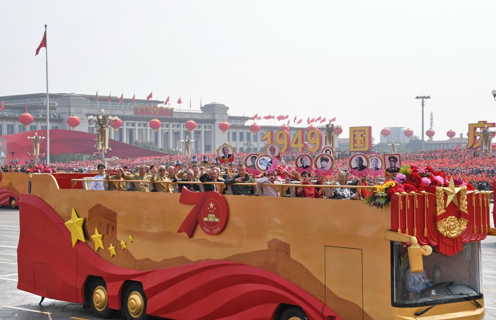 庆祝中华人民共和国成立70周年大会群众游行活动中,老一辈党和国家、军队领导人亲属代表,老一辈建设者和亲属代表,新中国成立前参加革命工作的老战士,老一辈军队退役英模、民兵英模和支前模范代表等乘坐的21辆礼宾车缓缓驶过天安门城楼(10月1日摄)。新华社记者李欣摄