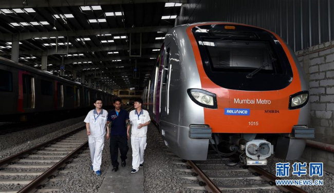 2018年6月27日,在印度孟买,中印双方工作人员在孟买地铁一号线车辆段工作。印度孟买地铁一号线于2014年6月8日正式运行,该地铁线路车辆由中车南京浦镇车辆有限公司制造。 新华社记者张迺杰摄