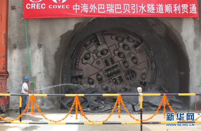 2019年4月16日,在尼泊尔苏尔凯德,一名中国工人给全断面岩石掘进机洒水。由中国企业承建的尼泊尔巴瑞巴贝引水隧道贯通仪式当天在苏尔凯德举行。 新华社记者周盛平摄