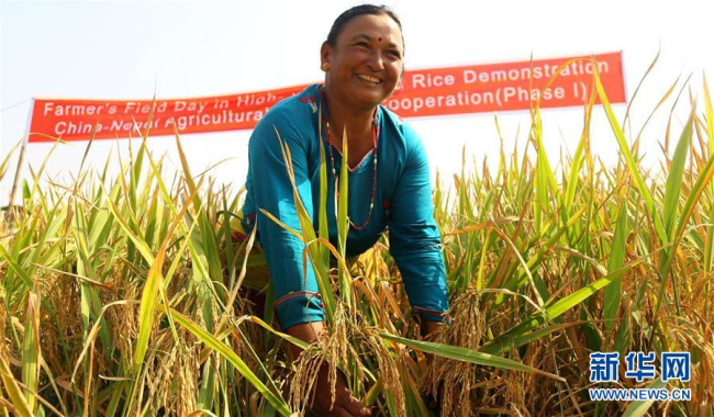 2017年10月23日,在尼泊尔巴克塔普尔,当地农民碧玛拉站在杂交水稻试验田里。从2016年2月开始,中国援尼农业技术合作项目组的专家们在尼泊尔加德满都、奇特旺等多个地区挑选了数个水稻和玉米试种点。一年多的试验显示,中国杂交水稻和玉米表现优异。 新华社发(苏尼尔·夏尔马摄)