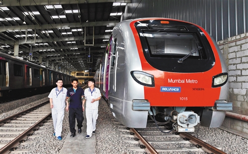 印度孟买地铁一号线于2014年6月8日正式运行,该地铁线路车辆由中车南京浦镇车辆有限公司制造。图为中印双方工作人员在孟买地铁一号线车辆段工作。(新华社发)
