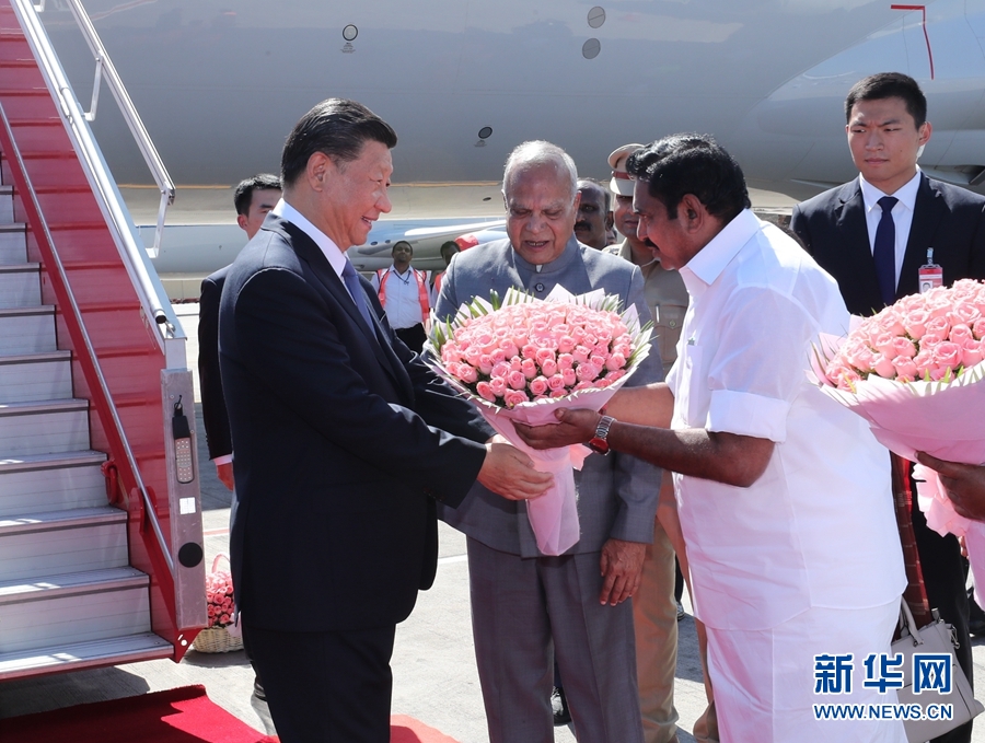 10月11日,国家主席习近平乘专机抵达金奈,应印度共和国总理莫迪邀请,出席中印领导人第二次非正式会晤。印度泰米尔纳德邦邦长普罗希特、首席部长帕拉尼斯瓦米等在舷梯旁迎接,向习近平敬献鲜花。 新华社记者 鞠鹏 摄