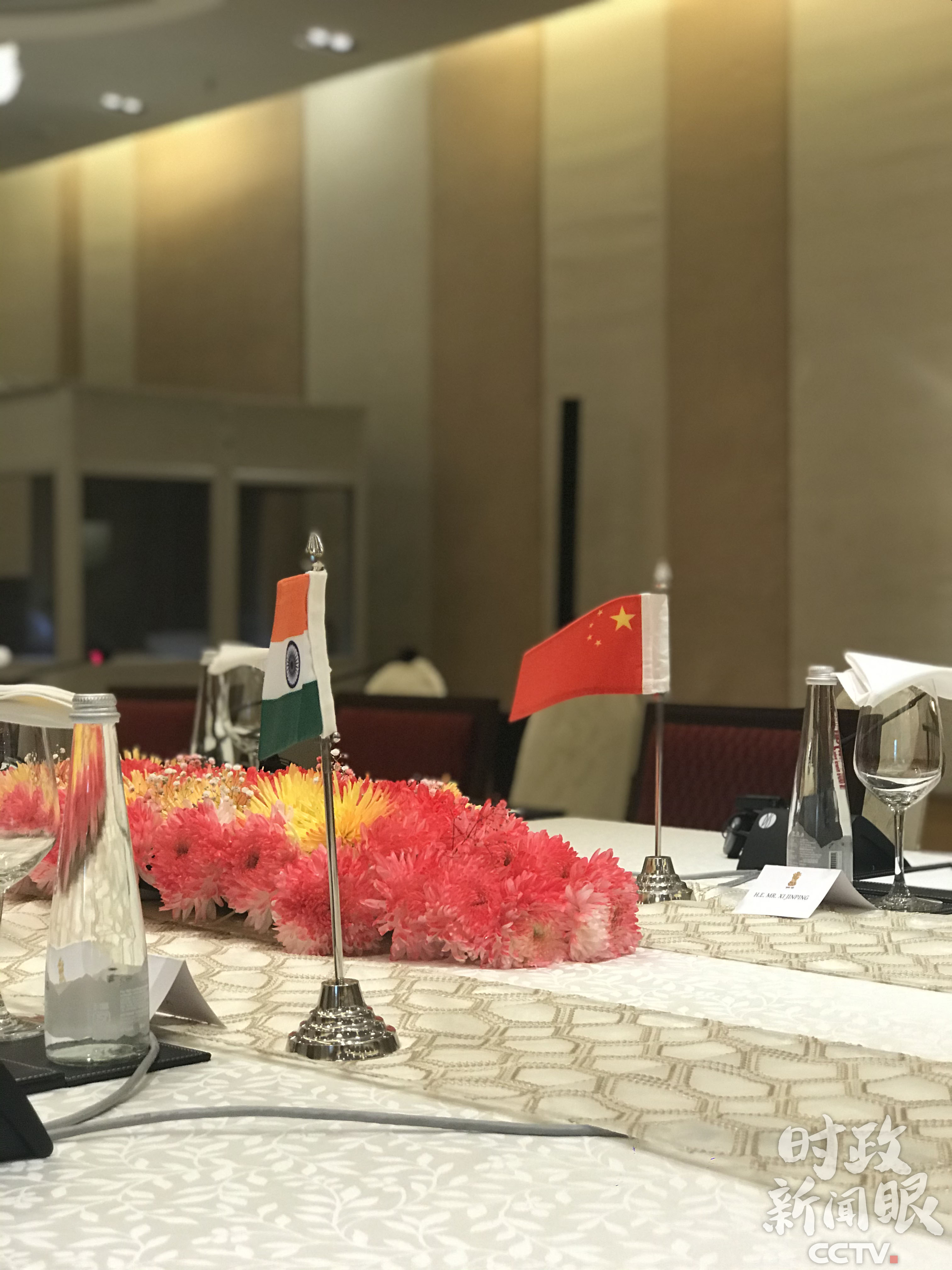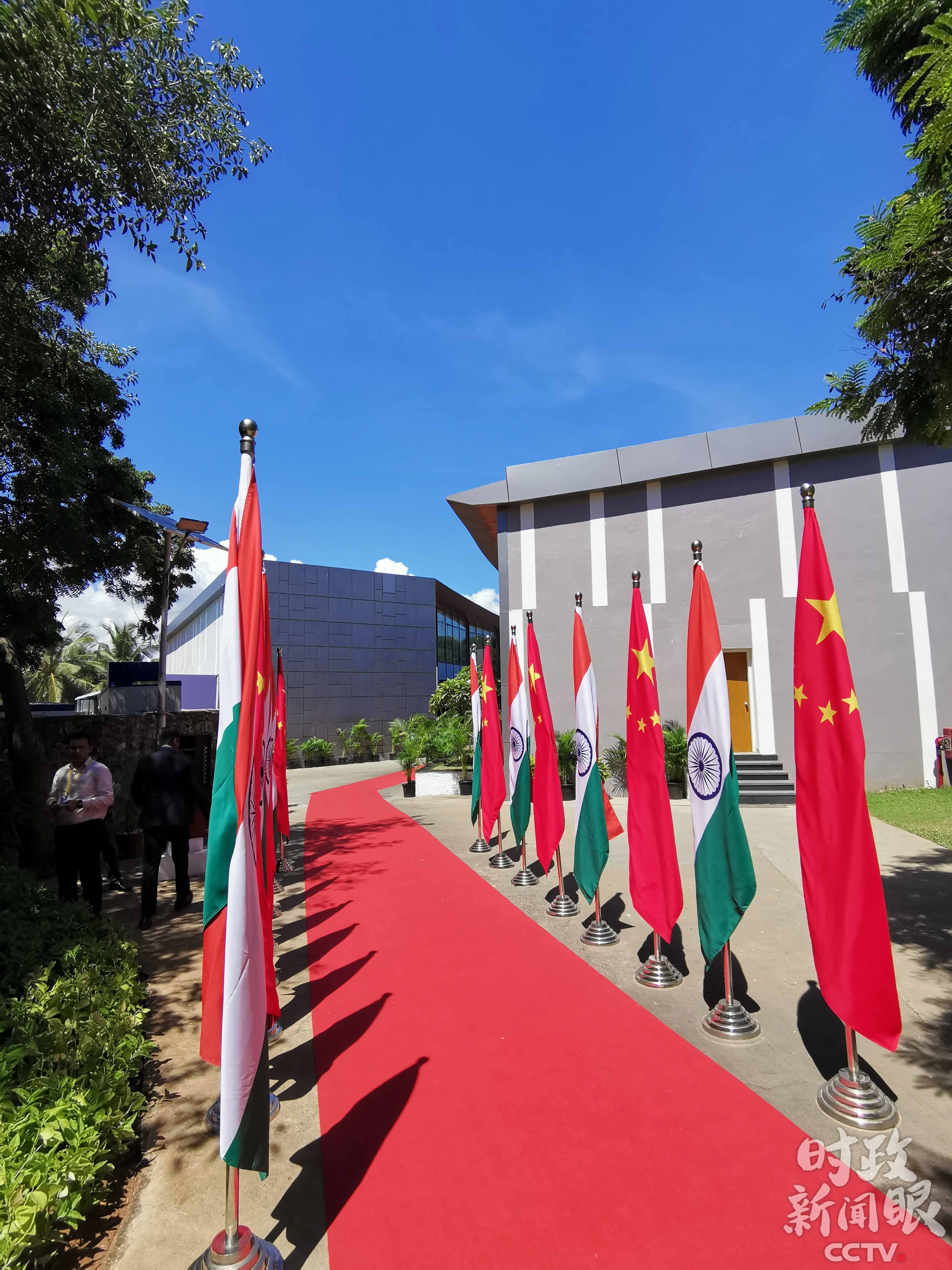 △下车处摆放着中印两国国旗。(央视记者张宇拍摄)