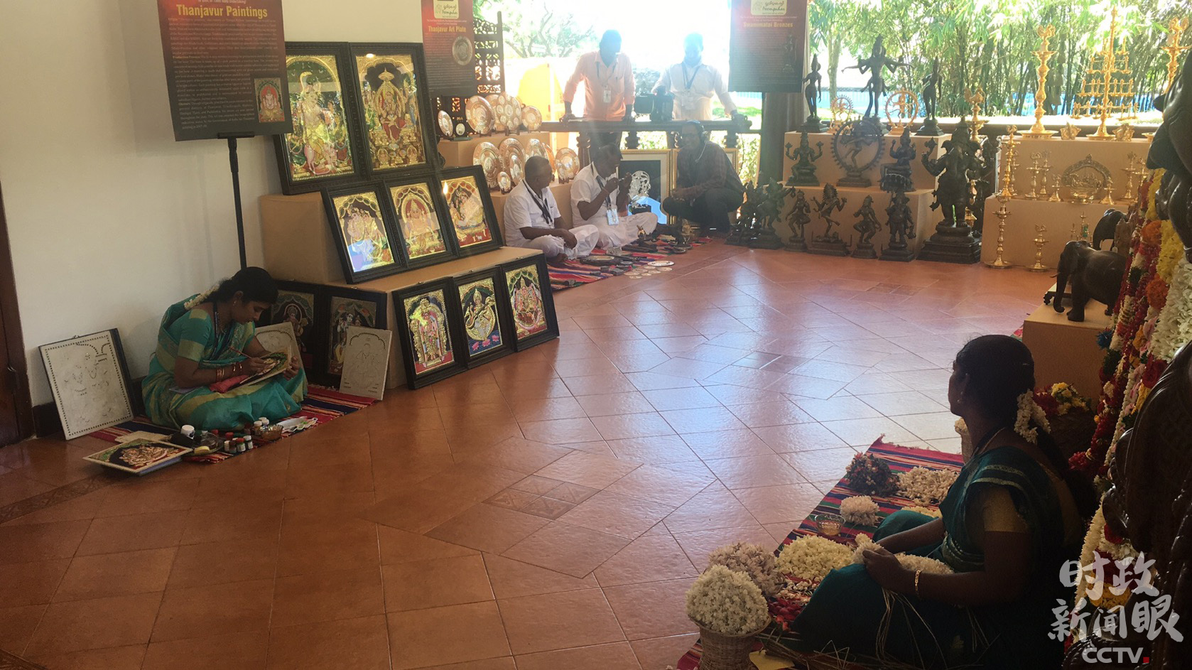 △在宴会厅的门厅里,陈列着特色工艺品。两国领导人在这里欣赏了民间工艺制作、表演。(央视记者李辉拍摄)