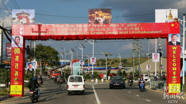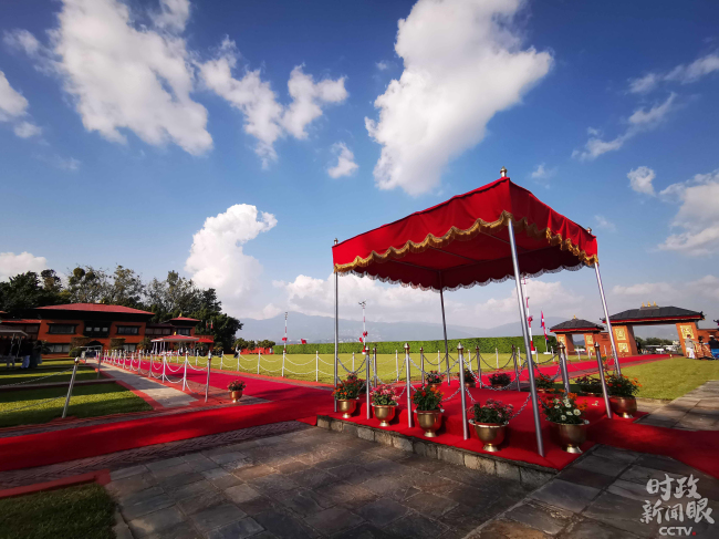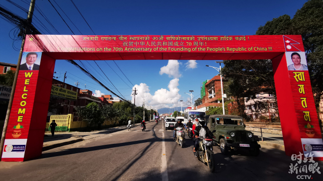 △“伟大的中尼友谊源远流长、牢不可破”拱门。(央视记者张晓鹏拍摄)