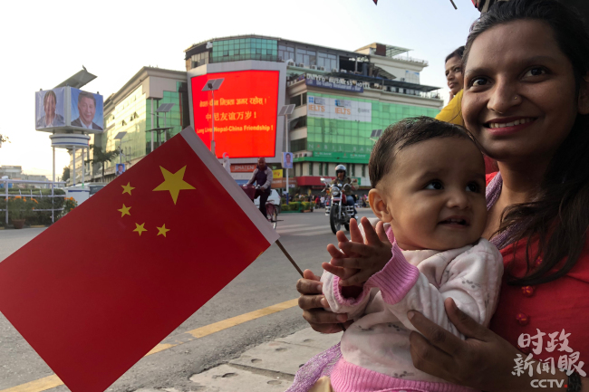 △加德满都市中心的大屏幕上,循环播放着今年4月习近平举行仪式欢迎班达里总统访华的视频。(央视记者张晓鹏拍摄)