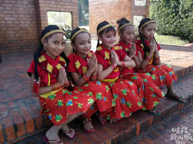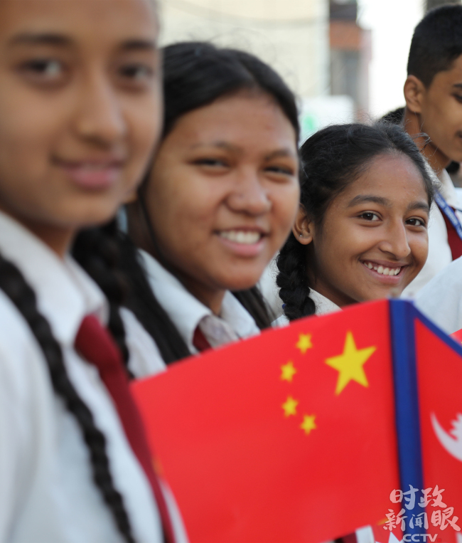 △尼泊尔儿童用中文欢迎习近平。他们说:“习爷爷好,见到你很高兴,我们爱你。”(央视记者沈忱拍摄)