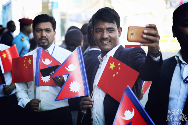 △手持中尼两国国旗的青少年。(央视记者贾建京拍摄)