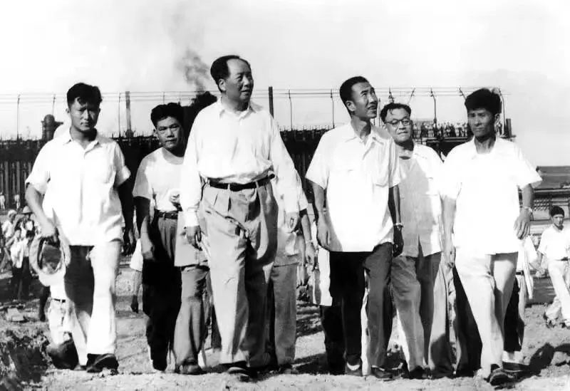 当武钢一号炉出铁之时,只见一条粗壮的火龙由炉口喷涌而出,蜿蜒伸展,顿时金星飞舞,热浪冲天。毛主席站在高台上聚精会神地观看。