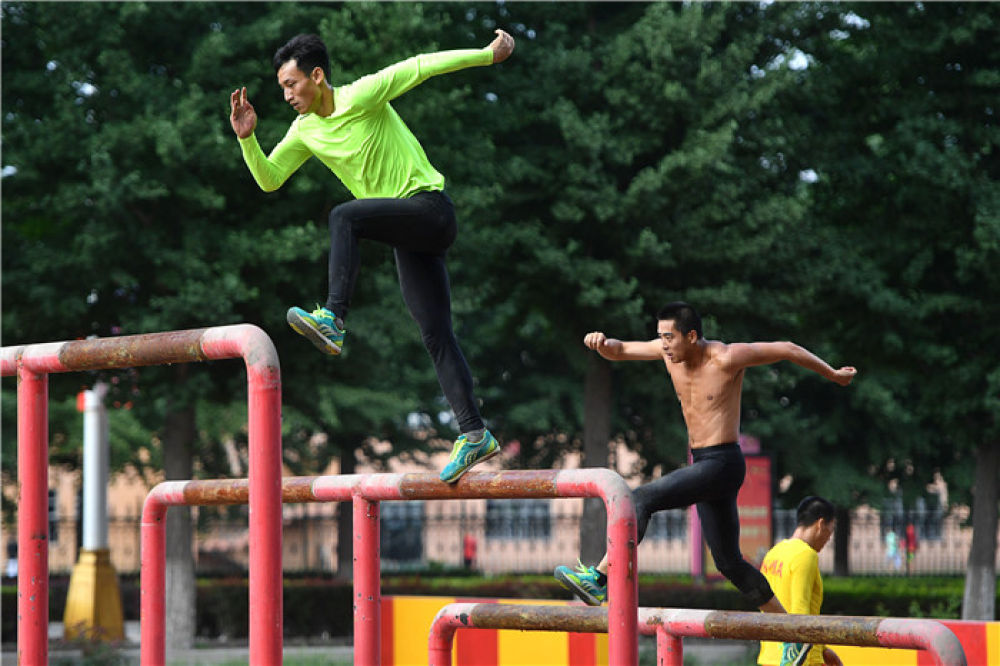 这是八一军事五项队男队员在进行500米障碍跑训练(2019年6月28日摄)。新华社记者熊琦摄