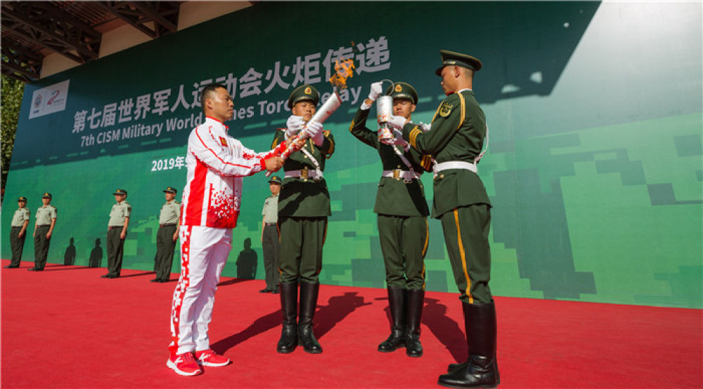 2019年9月23日,最后一名火炬手张勇(前左一)在火炬传递活动中引回圣火火种。当日,第七届世界军人运动会军营火炬传递活动第二站在陆军英雄部队“开国大典红一师”举行。本站主题是“传承红色基因、维护世界和平”,共有20名来自陆军的火炬手参与传递。新华社发(王昆摄)