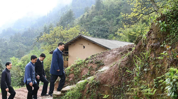 △2019年4月15日,在石柱土家族自治县华溪村,习近平总书记徒步前往农户家中,实地了解脱贫攻坚工作进展和解决“两不愁三保障”突出问题情况。
