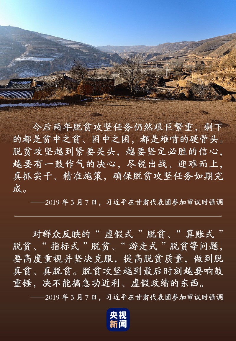 “换了三种交通工具到这里,就是想实地了解‘两不愁三保障’是不是真落地。我们在奔小康。小康不小康,关键看老乡,关键看扶贫工作做得怎么样。贫困群众脱贫最基本的标准,就是‘两不愁三保障’。”