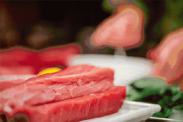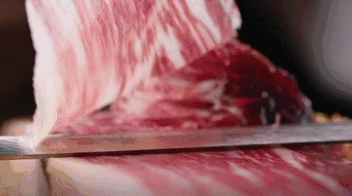 薄如纸片的绯红周围淡淡的粉色脂肪,如云缭绕,肌肉之间的纤维犹如丝网密布成大理石纹理。一片入口,谁不爱这两颊生香的曼妙滋味?