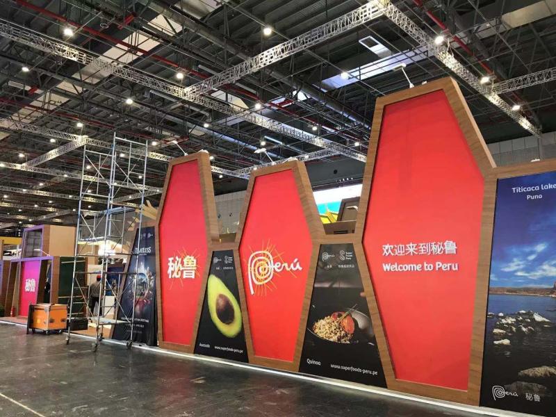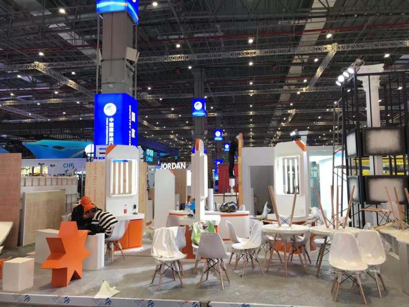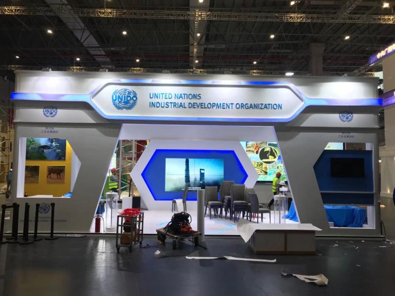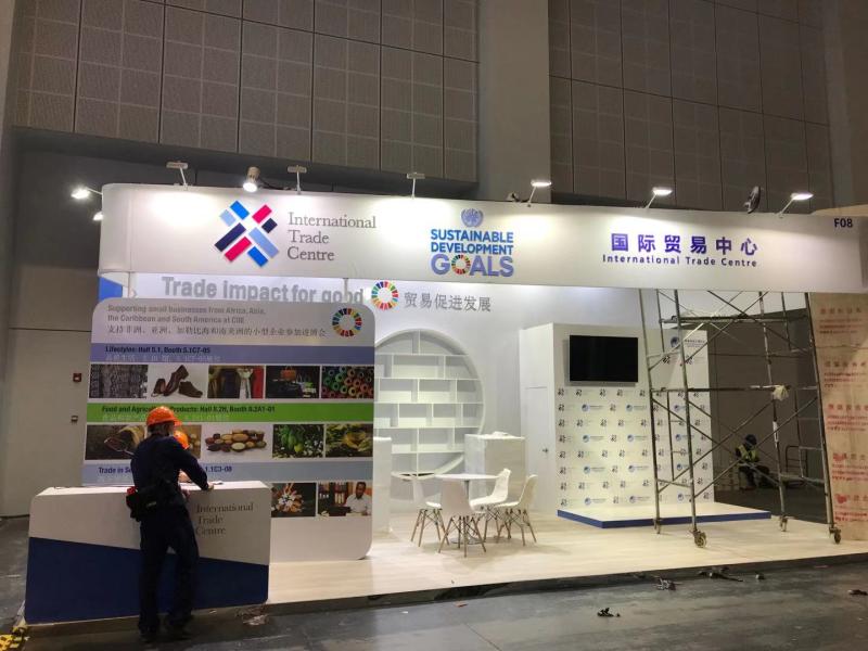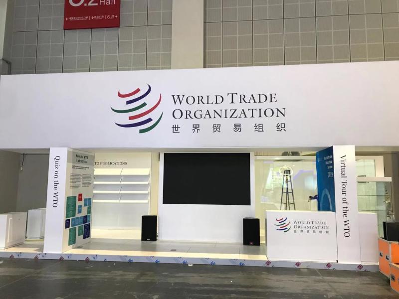从5.2号馆01号门进入展馆,最先映入眼帘的是国际贸易中心、世界贸易组织和联合国工业发展组织这三大国际组织的展台。以白色为主色调的三大国际组织展台,已完成基础搭建工作,正在进行装饰和布展。