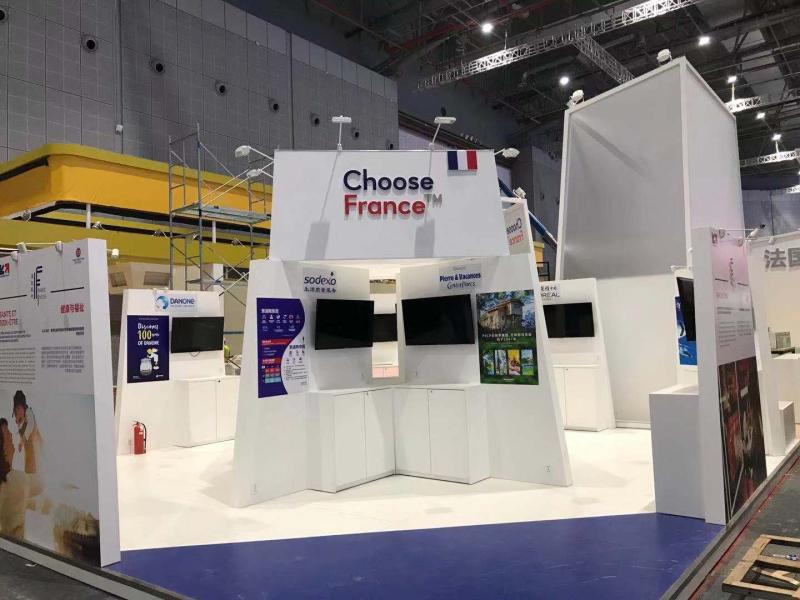 法国馆看似低调简洁,但其展示内容非常丰富。展台主色调为白色,运用不同的地板色调将展台划分为展商区、公共区、演讲区、品尝区与互动体验区。展台正中间的白色透明塔象征着巴黎铁塔,也是展台的公共区,游客可在该区咨询访问;左侧为展商区,分为4大主题:健康、可持续发展城市、美食美酒及科技,均可供专业观众访问;后侧为品尝区,可供客人品尝法国美食美酒,旁边为演讲区,展会期间会举办论坛演讲;右侧为互动体验区,游客可通过头戴式VR眼镜领略法国八个大区的风土人情。